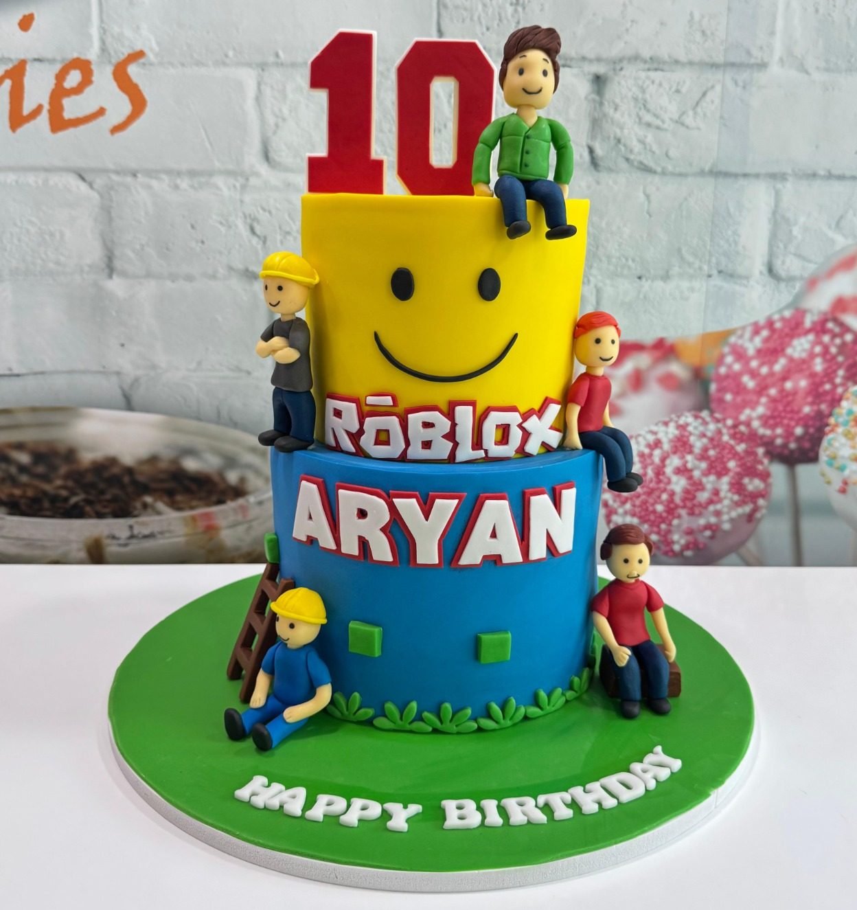 A bright, two-tier cake capturing the fun of Roblox. The top tier features the iconic yellow “Noob” smiley face. The blue base is personalized with the name. The design is complete with multiple edible Roblox character figures and a prominent “10” topper.