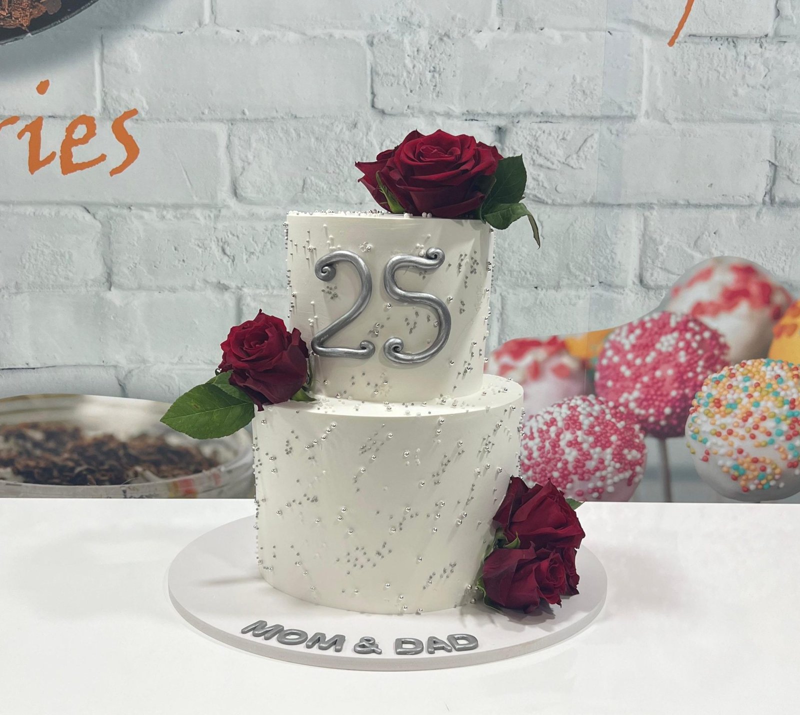 A beautifully textured 2-tier cake adorned with fresh red roses and a silver number topper. Elegant and timeless—perfect for milestone celebrations or special occasions.