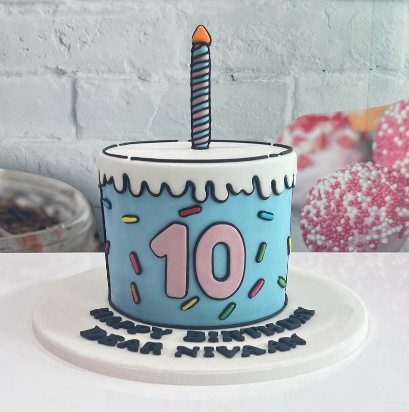 Bring a comic book to life with this trendy “cartoon” cake. Featuring bold black outlines, a vibrant sky-blue base, and colorful 2D sprinkles, it’s a whimsical and modern way to celebrate a 10th birthday.