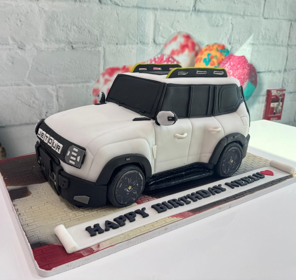 A striking, fully sculpted 3D cake of a white off-road SUV (Jeep/Defender style), detailed with black trim and tires. The cake base is designed like a brick road.