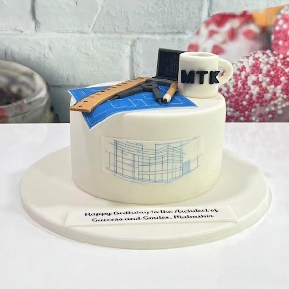 A minimalist white cake topped with edible drafting tools, including a ruler, compass, and blueprints. It features a custom “MTK” coffee mug and a heartfelt message for a successful architect.