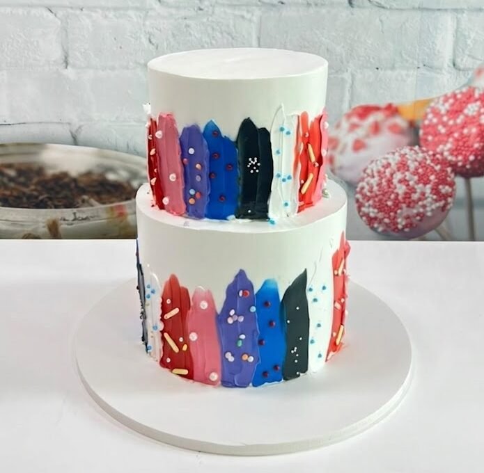 A sophisticated two-tier white cake featuring textured, vertical “brushstrokes” in a palette of pink, purple, blue, and red, accented with delicate edible pearls.