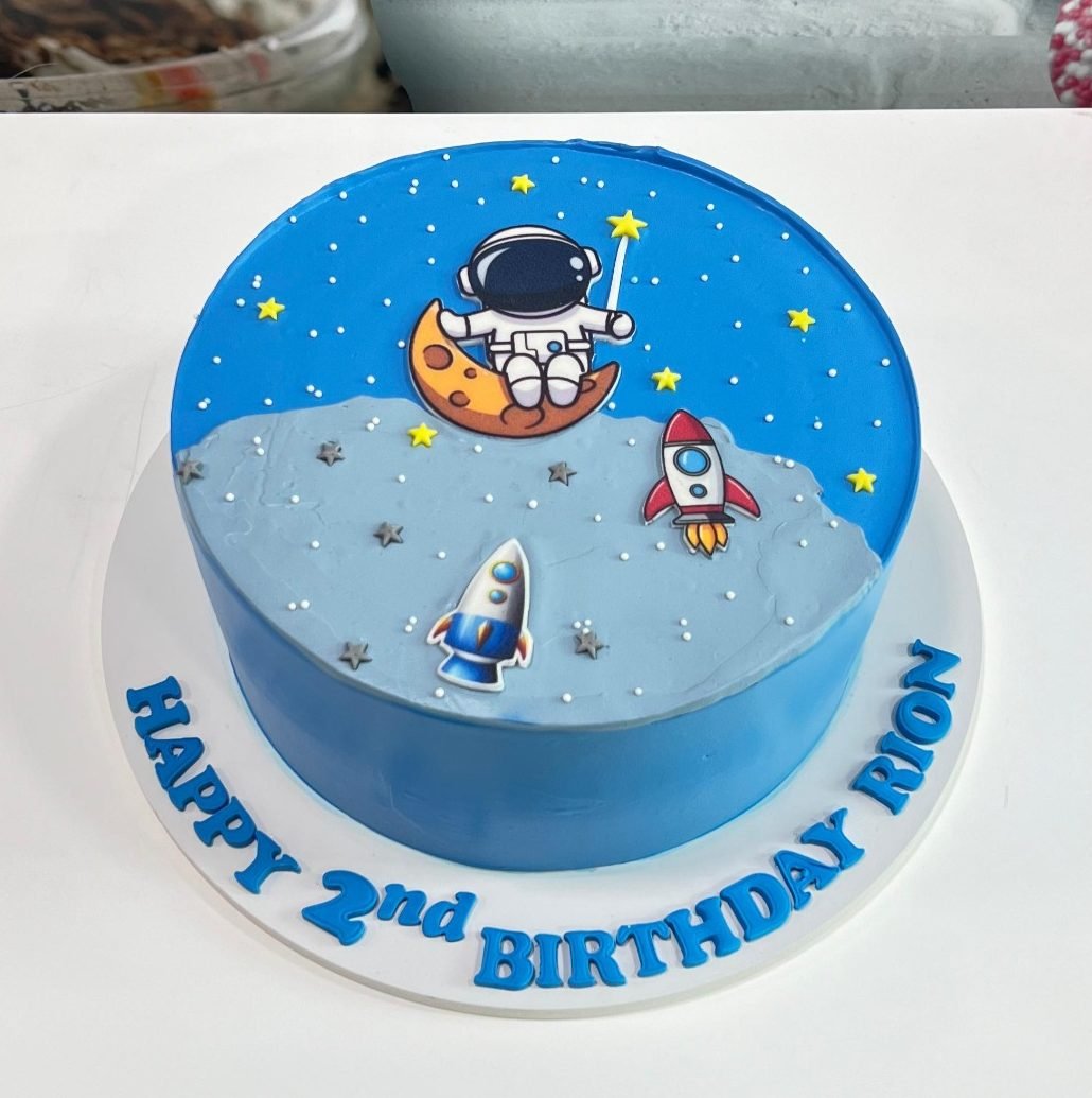 A fun, celestial-themed cake for a 2nd birthday. The two-tone blue cake features a sky background with stars, a cartoon astronaut sitting on a crescent moon, and two rocket ship cutouts.