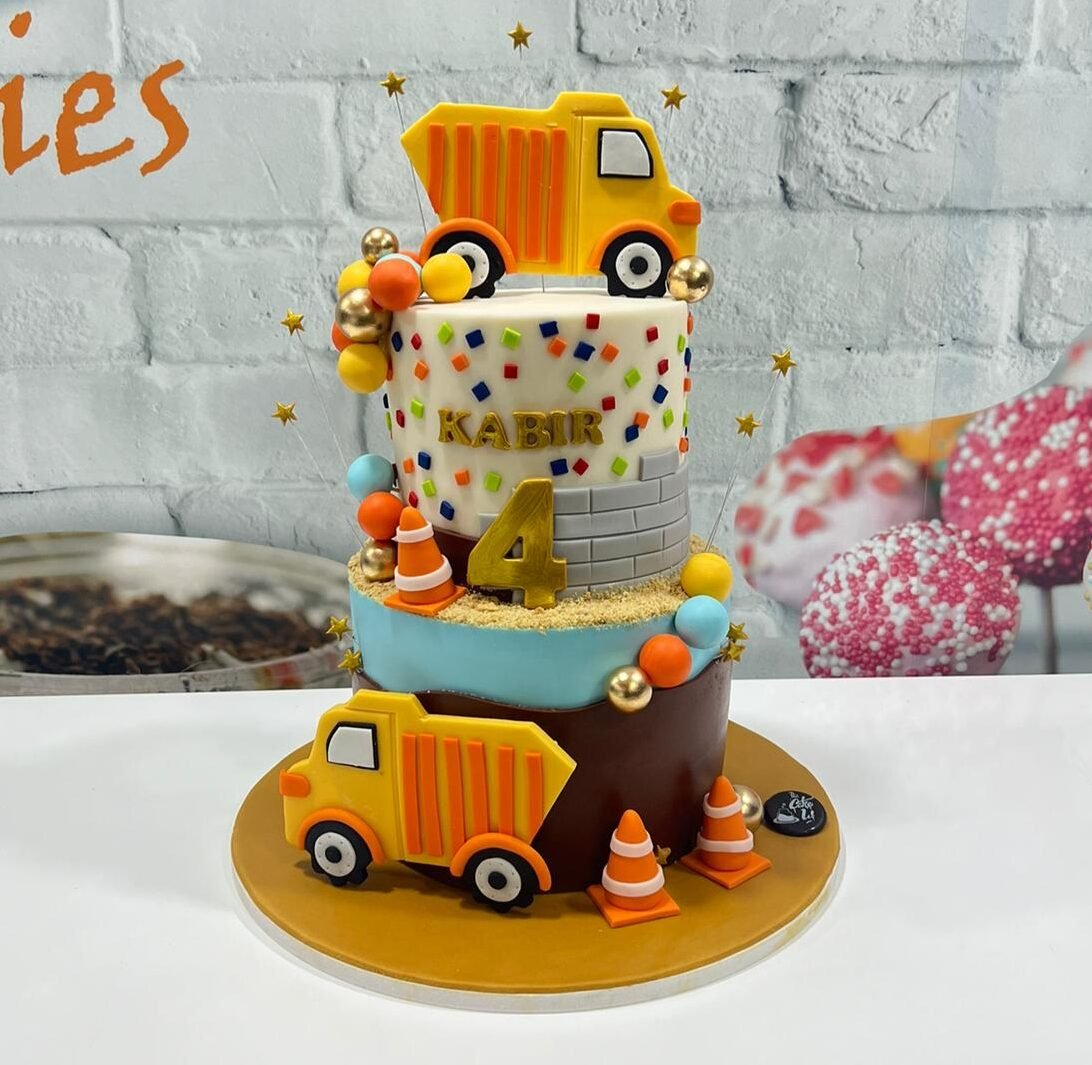 A multi-tiered masterpiece for the little builder! Features edible dump trucks, traffic cones, and “gravel” details for a 4th birthday to remember.