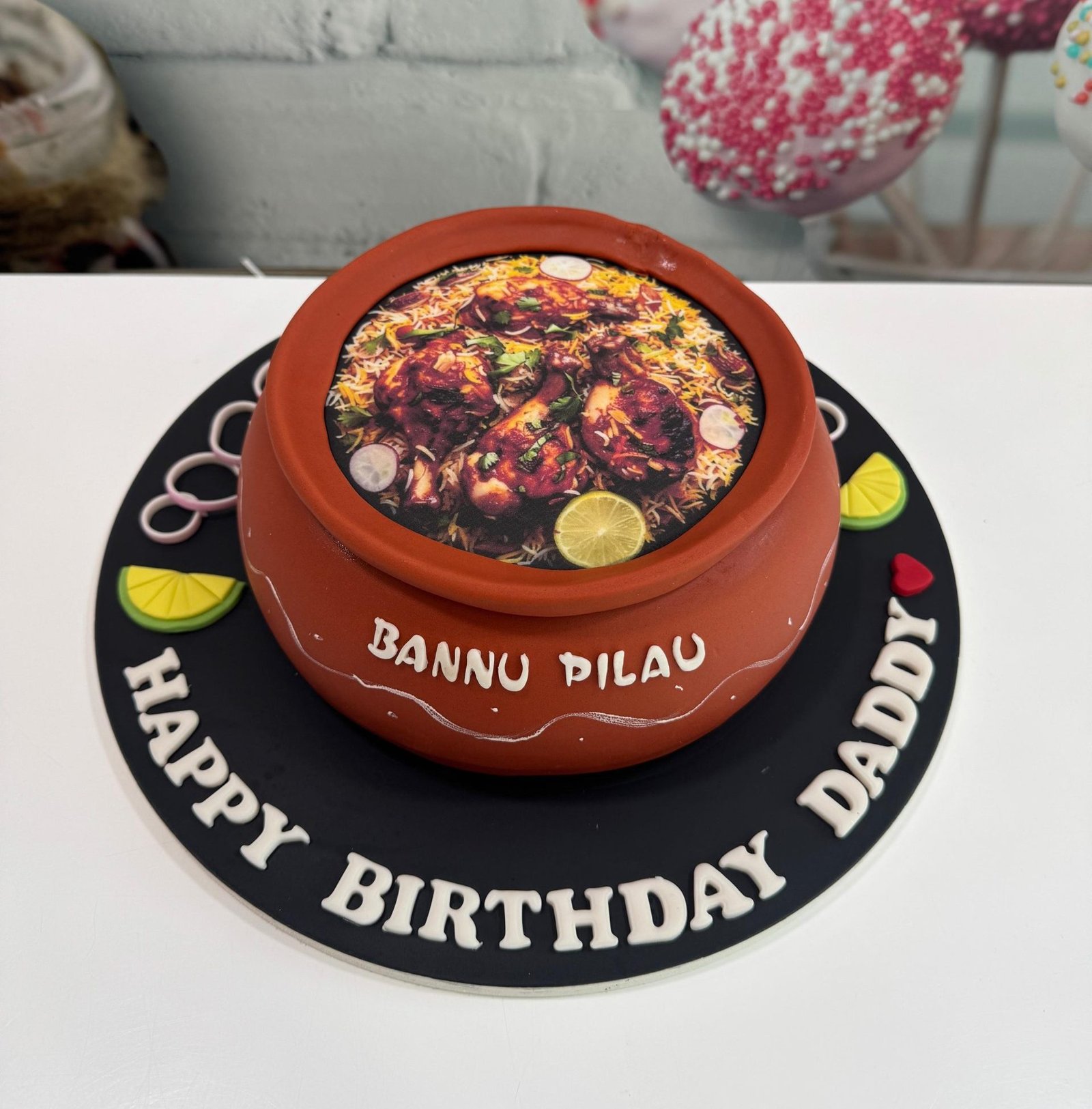 A unique, custom cake shaped and decorated like an earthenware handi pot filled with an edible image of Biryani. A heartwarming and thoughtful birthday cake for a food lover.