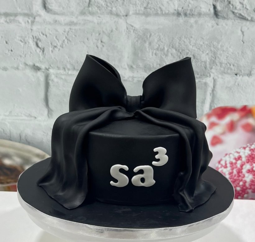A sleek, dramatic, single-tier black fondant cake perfect for a modern celebration. It is wrapped in a smooth black fabric-like drape that gathers at the top in a large, elegant bow. The simple front features the personalized white monogram