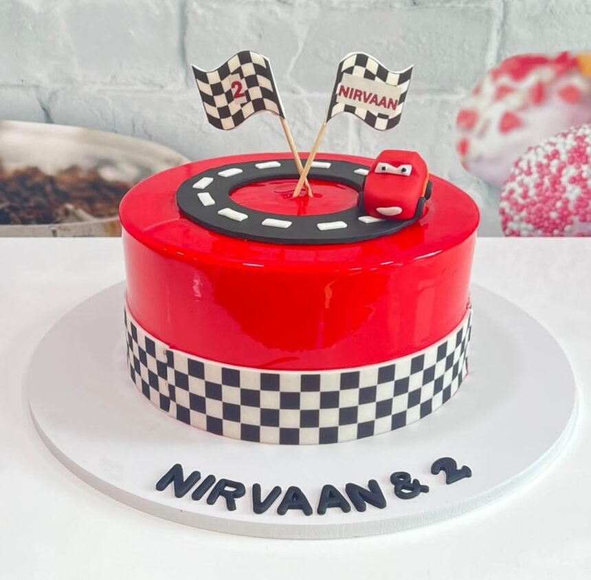 Rev up the excitement with this high-octane racing-themed cake. Featuring a sleek, vibrant red mirror-glaze finish, checkered flag accents, and a custom racing car topper, this bold design is the perfect way to celebrate a fast-paced milestone in style.