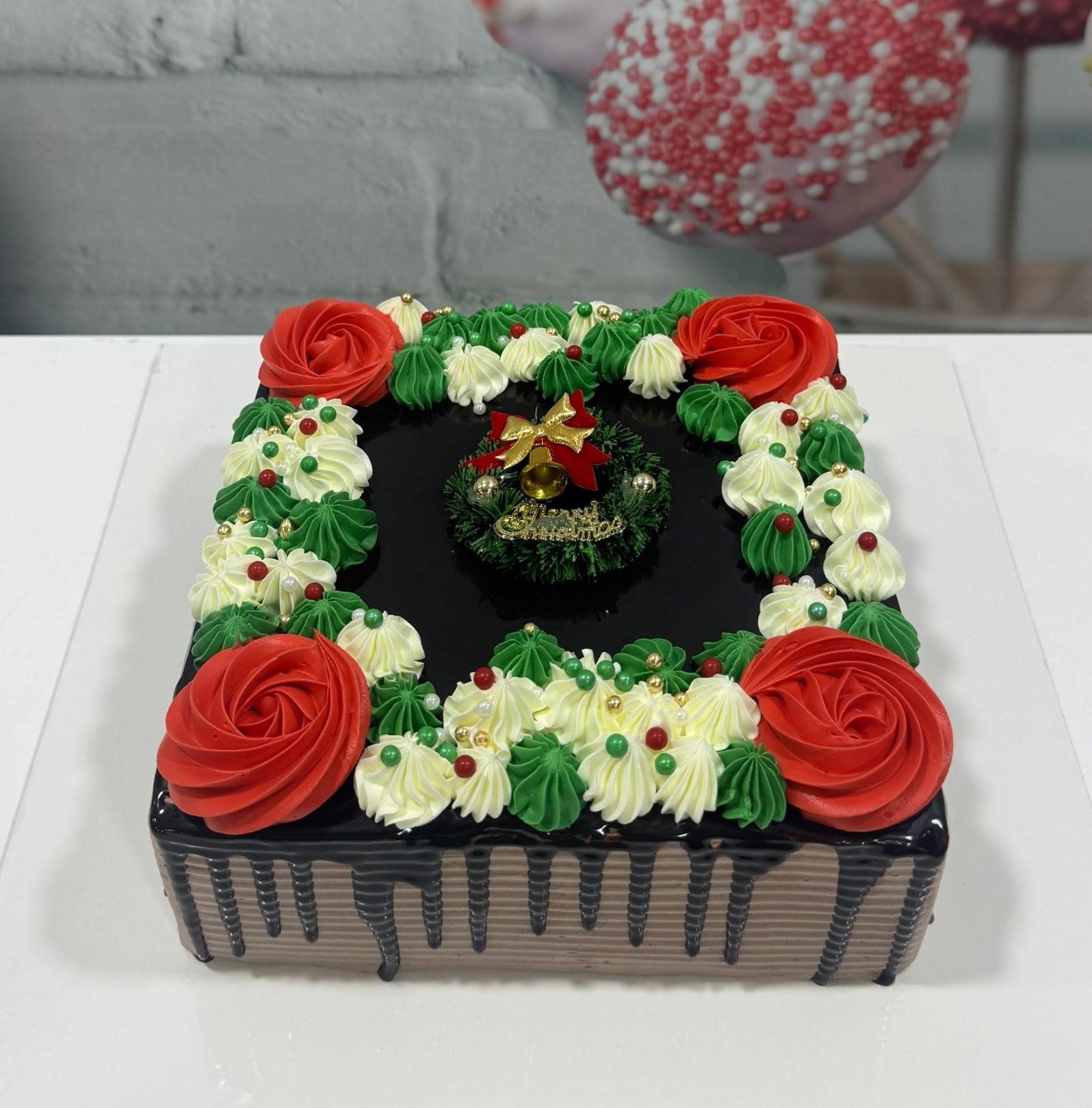 A rich square cake with chocolate drip, beautifully bordered by Christmas wreath piping and red roses. Festive and classic.
