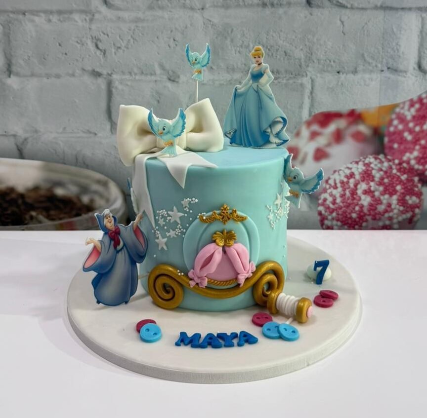 A light blue fondant cake inspired by a classic fairy tale. Features a 3D pumpkin carriage, delicate white stars, and character toppers including a princess and her helpful bluebird friends. Finished with a large white fondant bow.