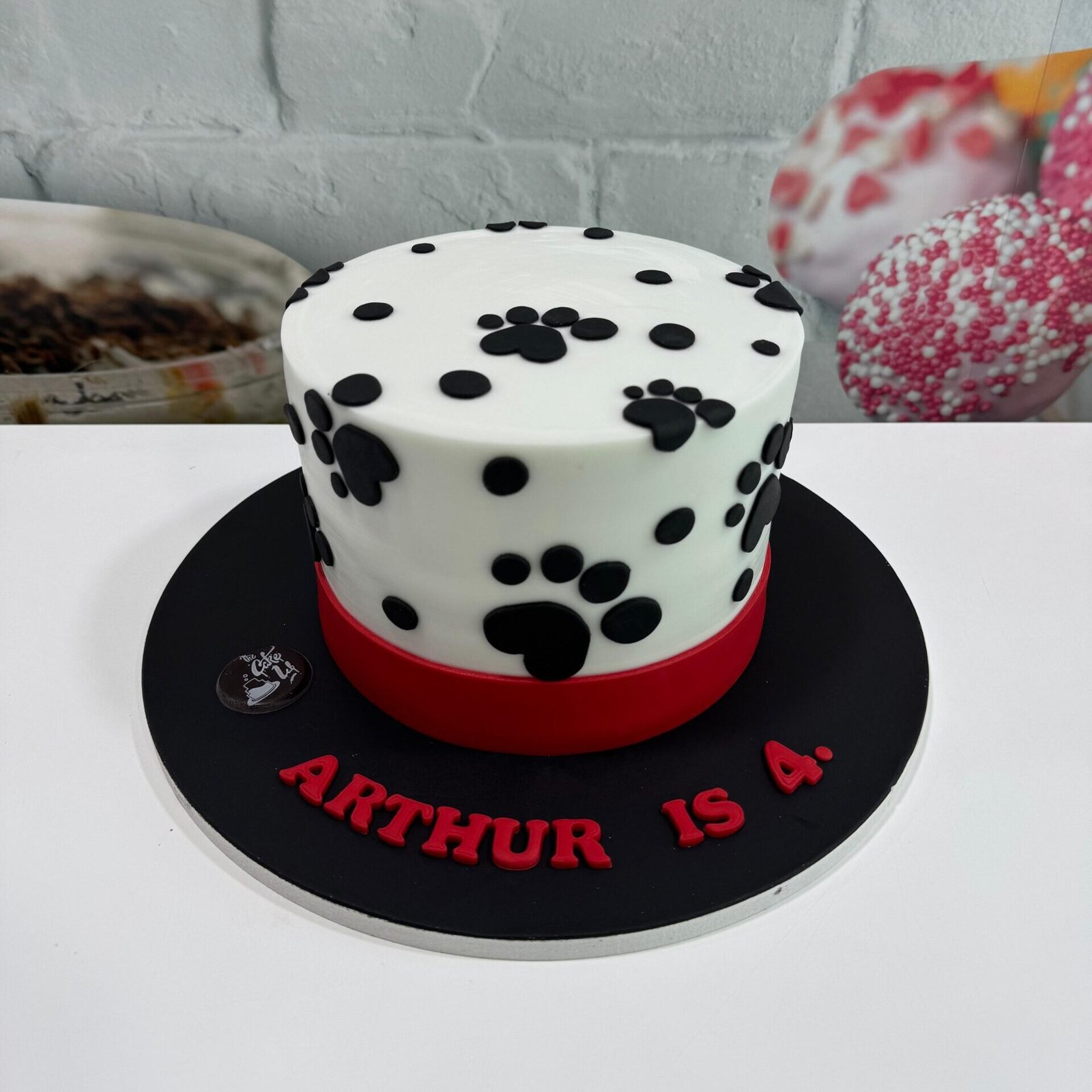 An adorable choice for pet lovers or 101 Dalmatians fans. A clean white fondant base covered in playful black paw prints and spots, finished with a bold red ribbon border at the base.