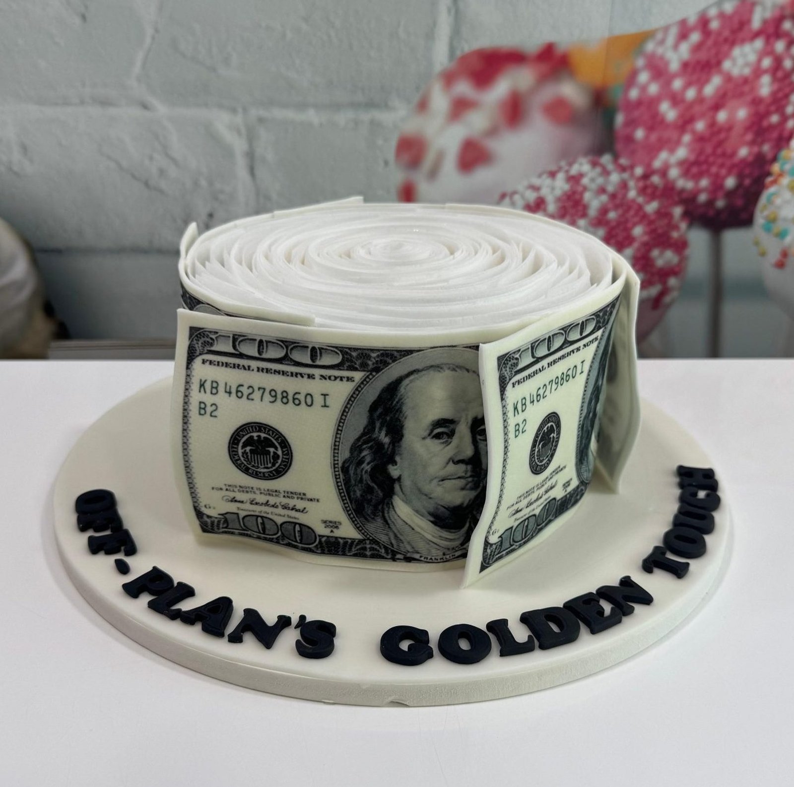 Striking cake celebrating wealth and success. Shaped and decorated to look like a giant roll of $100 bills (edible print).