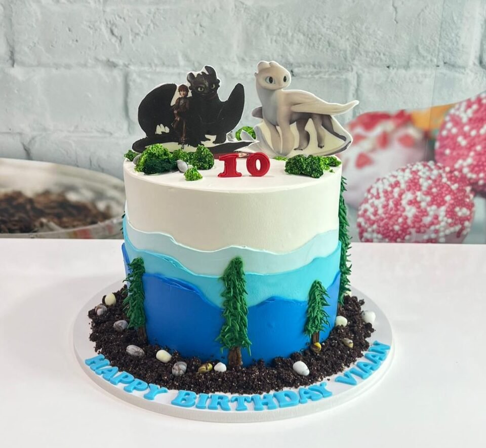 Bring the magic of the Hidden World to life with this detailed, layered landscape cake. Featuring vibrant blue mountain tiers, hand-piped forest evergreens, and custom dragon character toppers, this design is finished with a textured “earth” base for a professional and adventurous look.