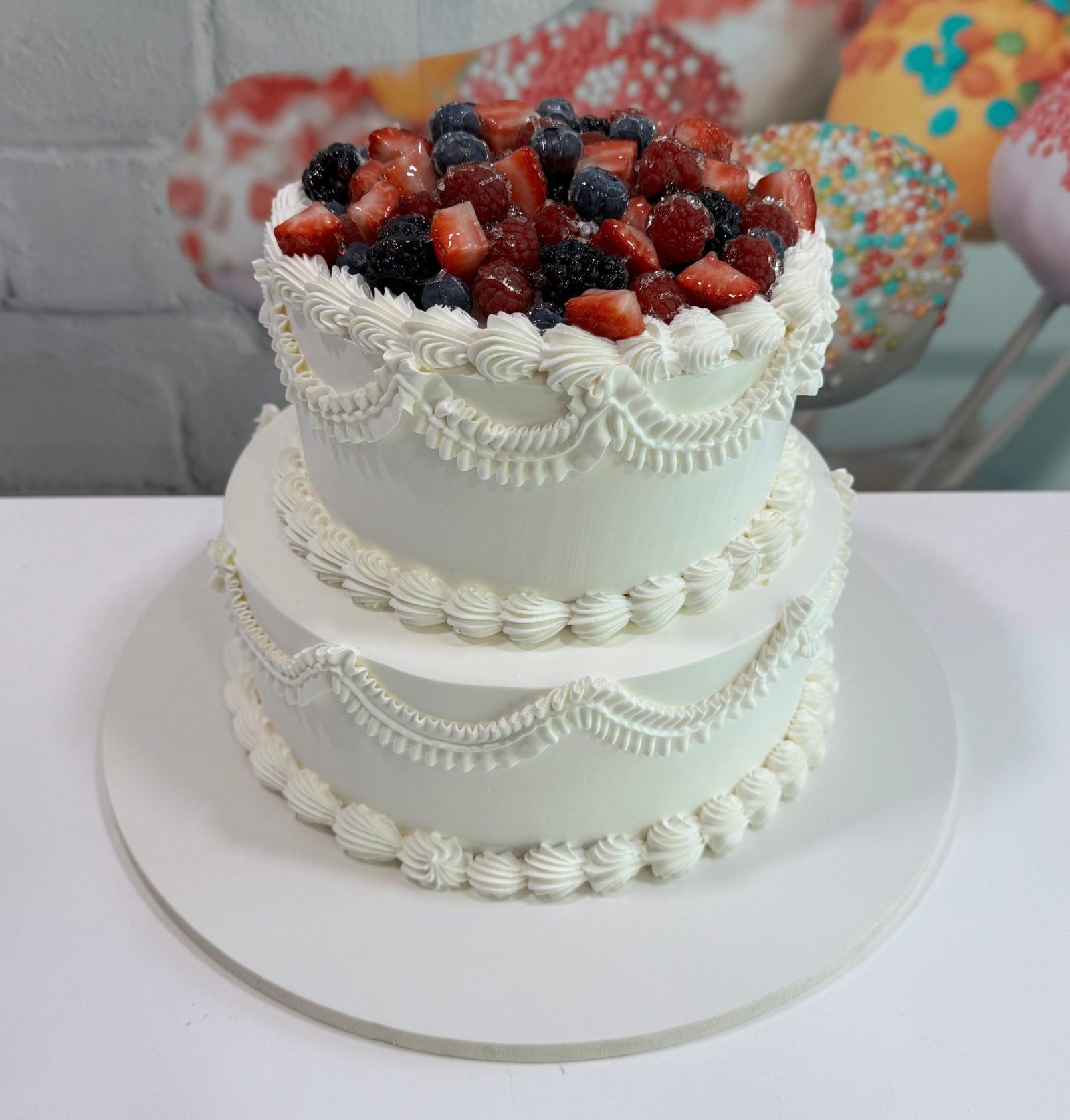A beautiful two-tiered white cake featuring classic piped lace frosting borders and a generous topping of fresh, glazed mixed berries (strawberries, blueberries, and blackberries). Perfect for weddings or garden parties.