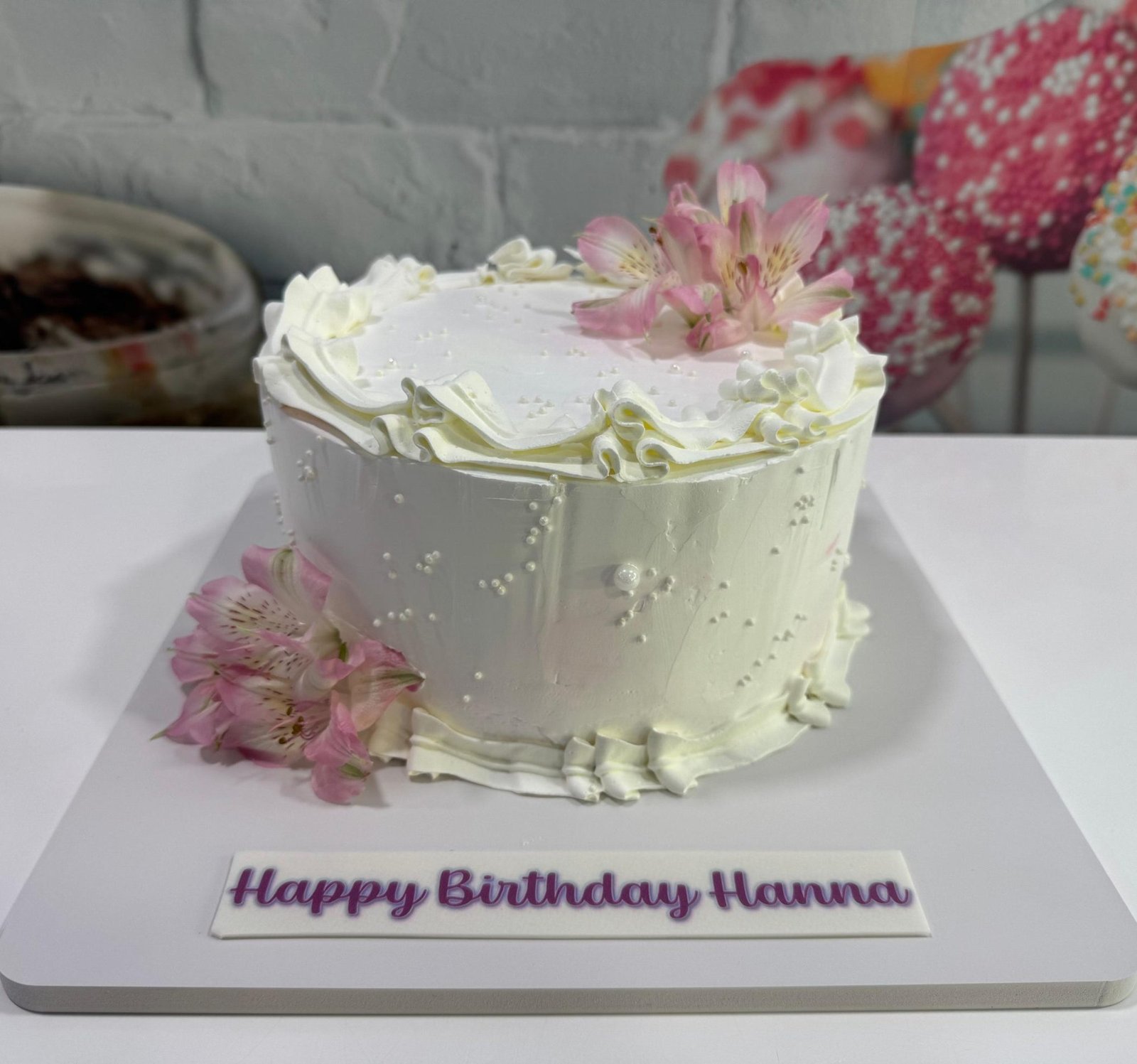 Elegant white whipped cake with delicate pearl sprinkles and a textured finish. Crowned with fresh pink and white flowers (Alstroemeria)