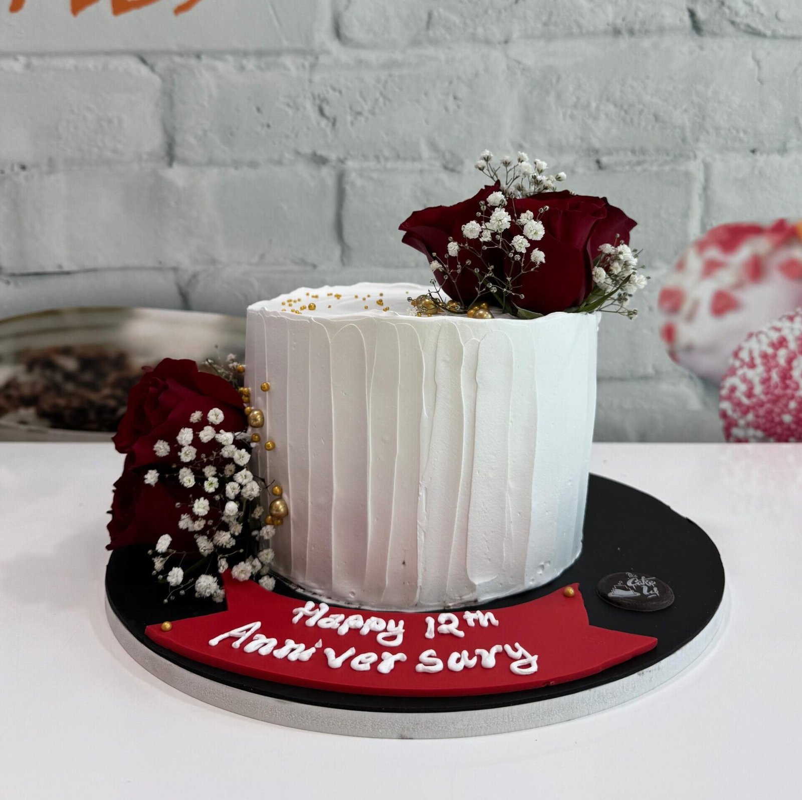 Celebrate a dozen years of love with this sophisticated white textured cake. Adorned with deep red roses, delicate baby’s breath, and subtle golden pearls, it’s a timeless and romantic choice for an anniversary milestone.
