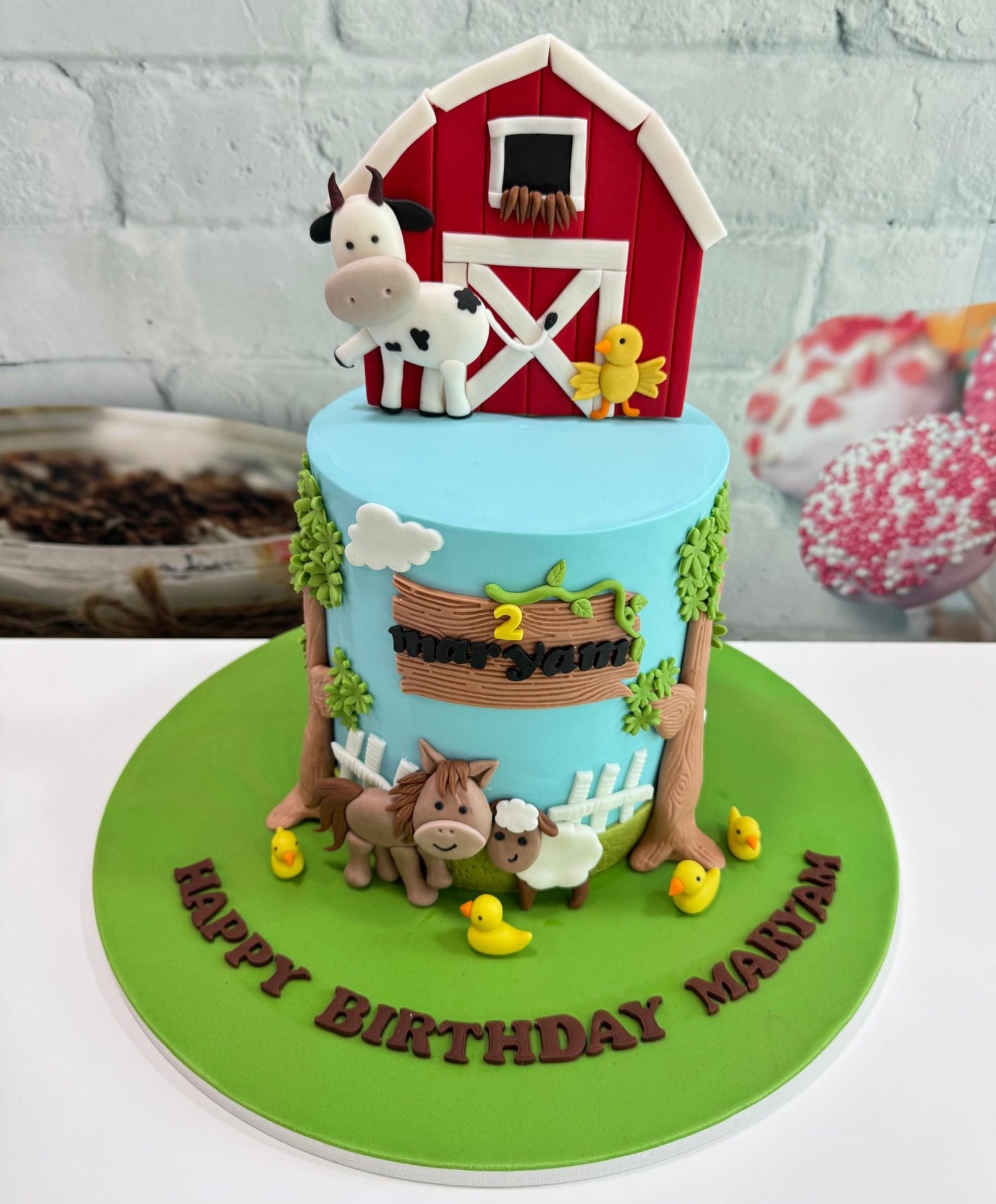 A cheerful farm scene complete with a barn, cow, chicks, and more friendly animals! Perfect for a fun, playful young child’s birthday.