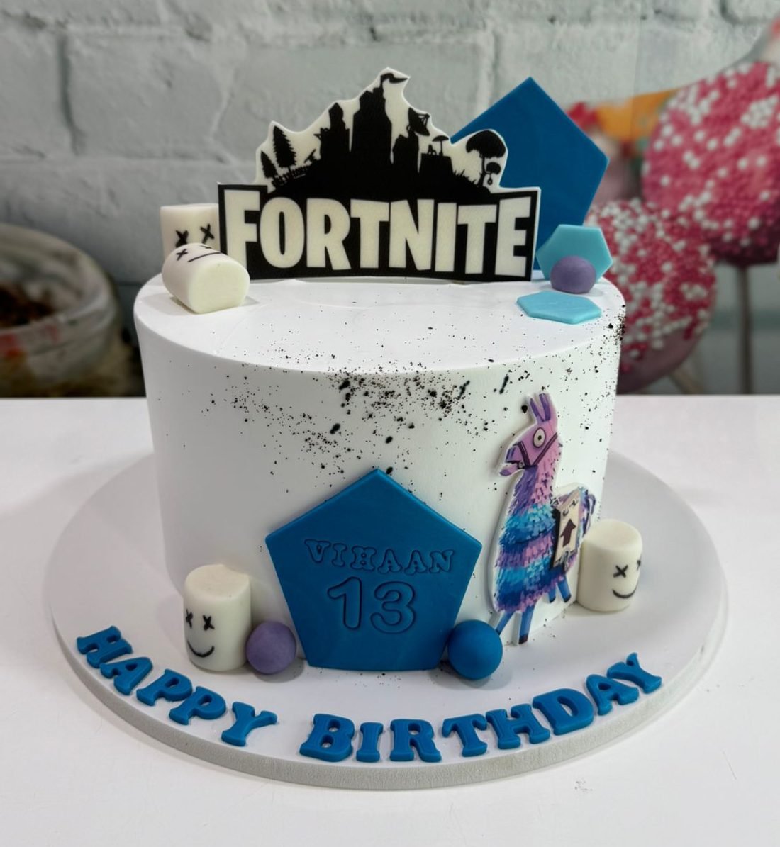 A sleek white cake splattered with ‘dust,’ featuring the Fortnite logo, building silhouettes, and the iconic Loot Llama. A battle royal centerpiece for a 13th birthday or gaming party.