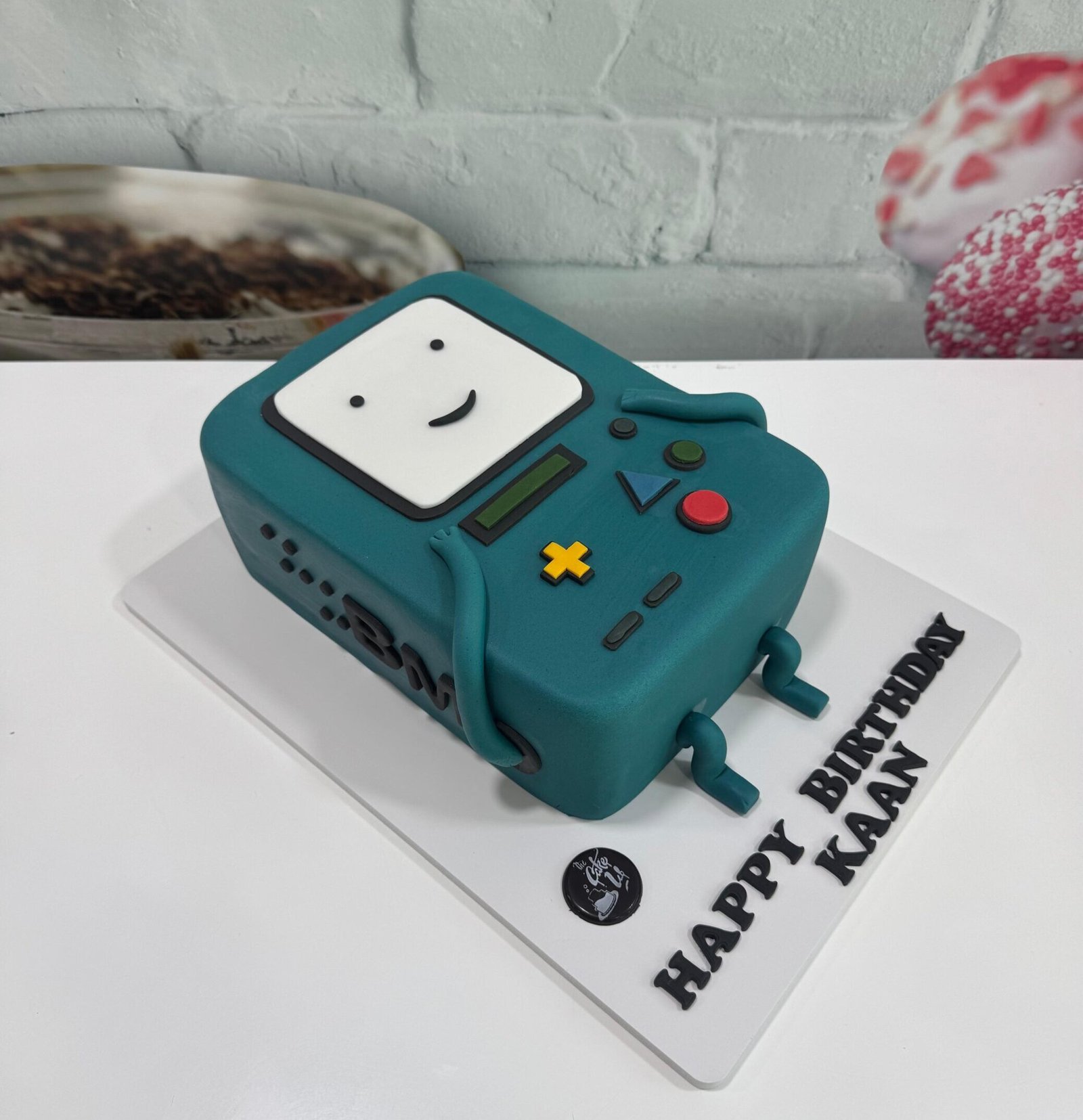 A playful, 3D character cake bringing Adventure Time’s BMO to life with clean fondant detailing and a sweet smile.