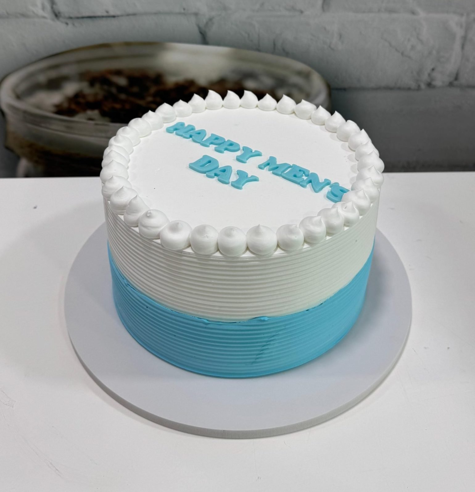 A clean, modern white cake contrasted with a bold blue bottom tier and simple white piping, featuring a ‘Happy Men’s Day’ message. Understated elegance for any occasion.