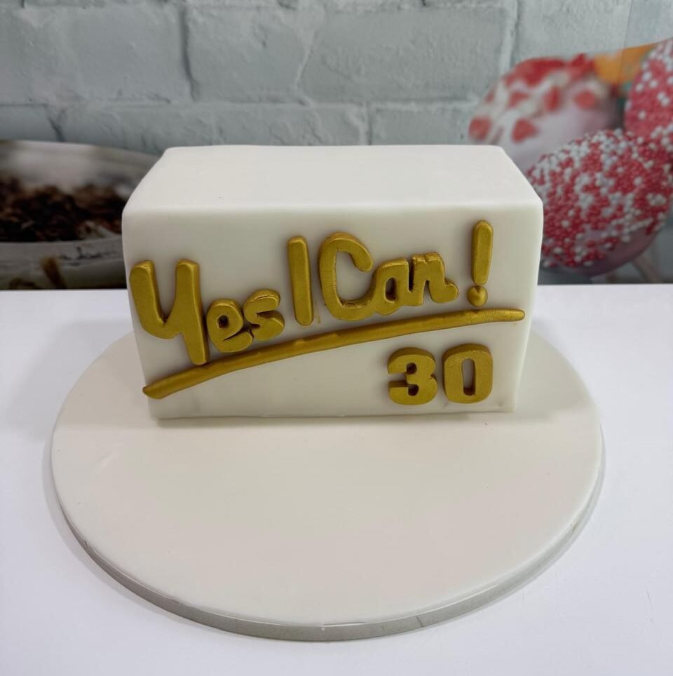 A minimalist rectangular block cake in ivory, featuring a bold, gold-embossed “Yes I Can!” message for a 30th birthday.