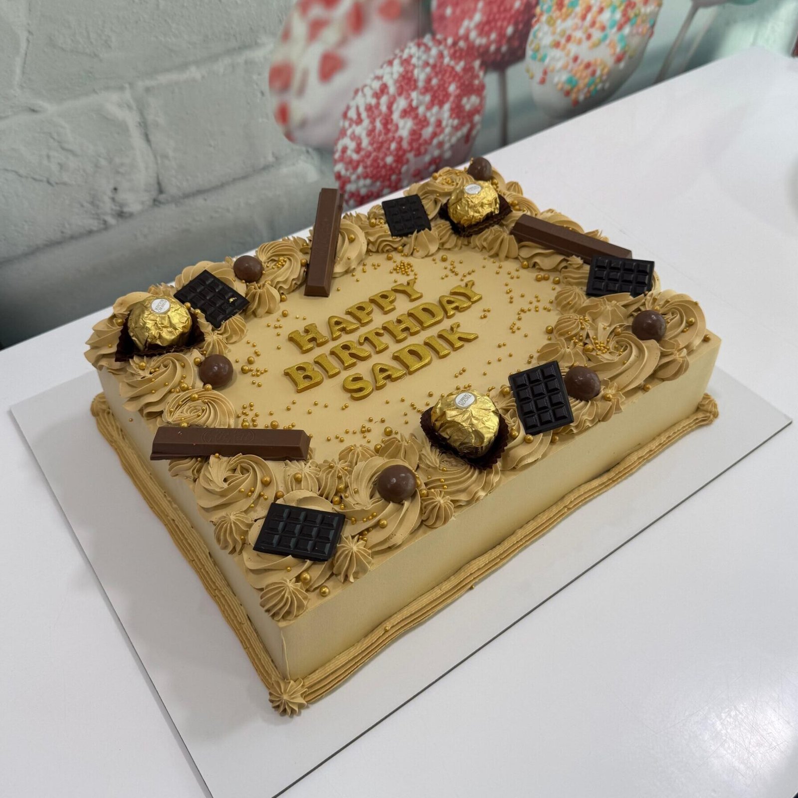 A premium rectangular chocolate-themed cake featuring smooth caramel-colored frosting. Decorated with Ferrero Rocher, KitKat bars, mini chocolate bars, and gold sprinkles.