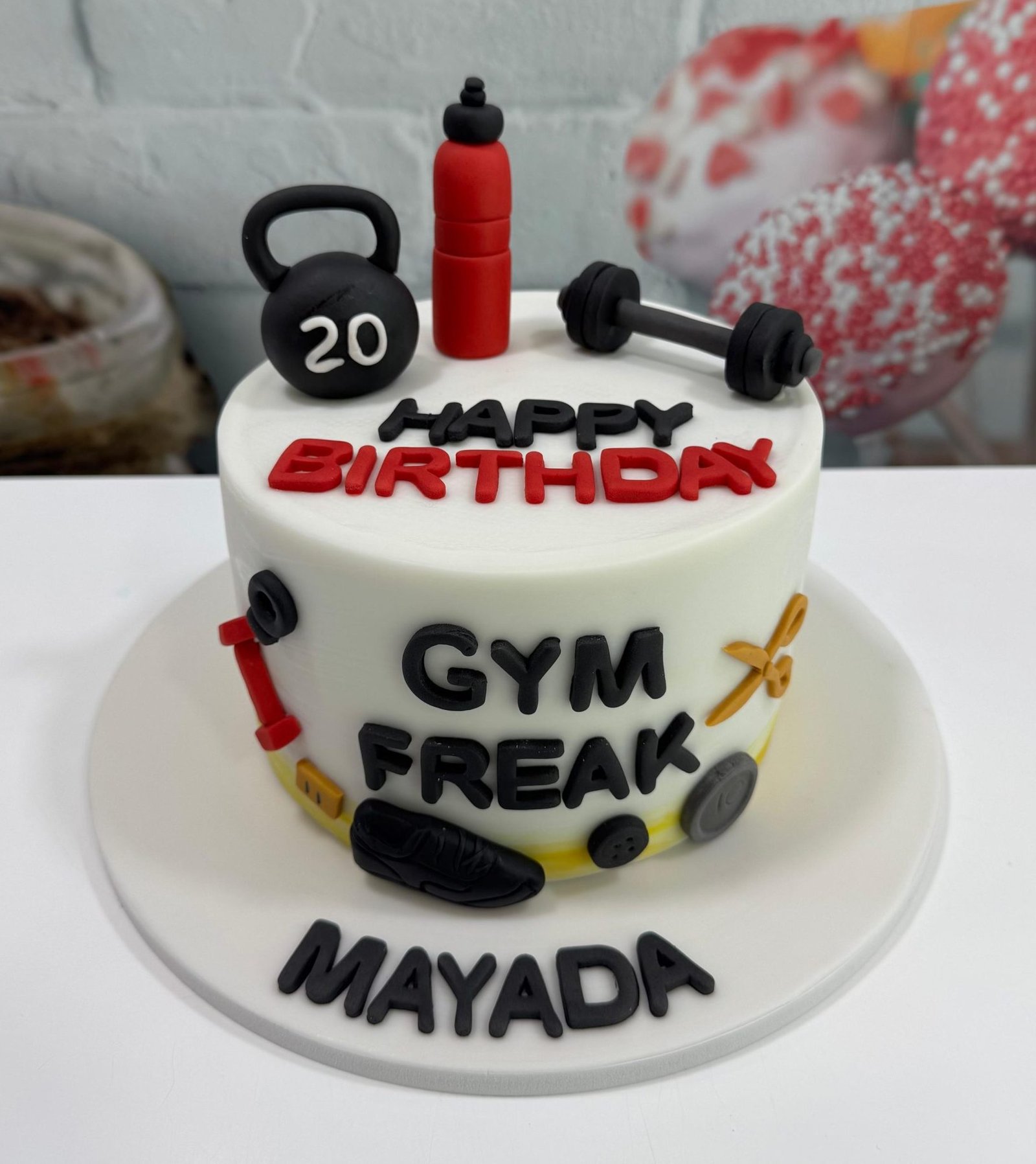 A motivating white cake dedicated to the fitness enthusiast, topped with edible gym gear like a kettlebell, dumbbell, and water bottle. Perfect for gym lovers and milestone birthdays!