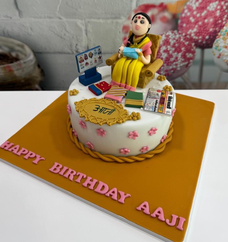 Celebrate the heart of the family with this incredibly detailed tribute cake. This design features a grandmother (“Aaji”) in a traditional yellow saree, relaxing in her favorite rocking chair with her hobbies—including miniature newspapers and a TV—making it a truly personal and sentimental gift for her special day.