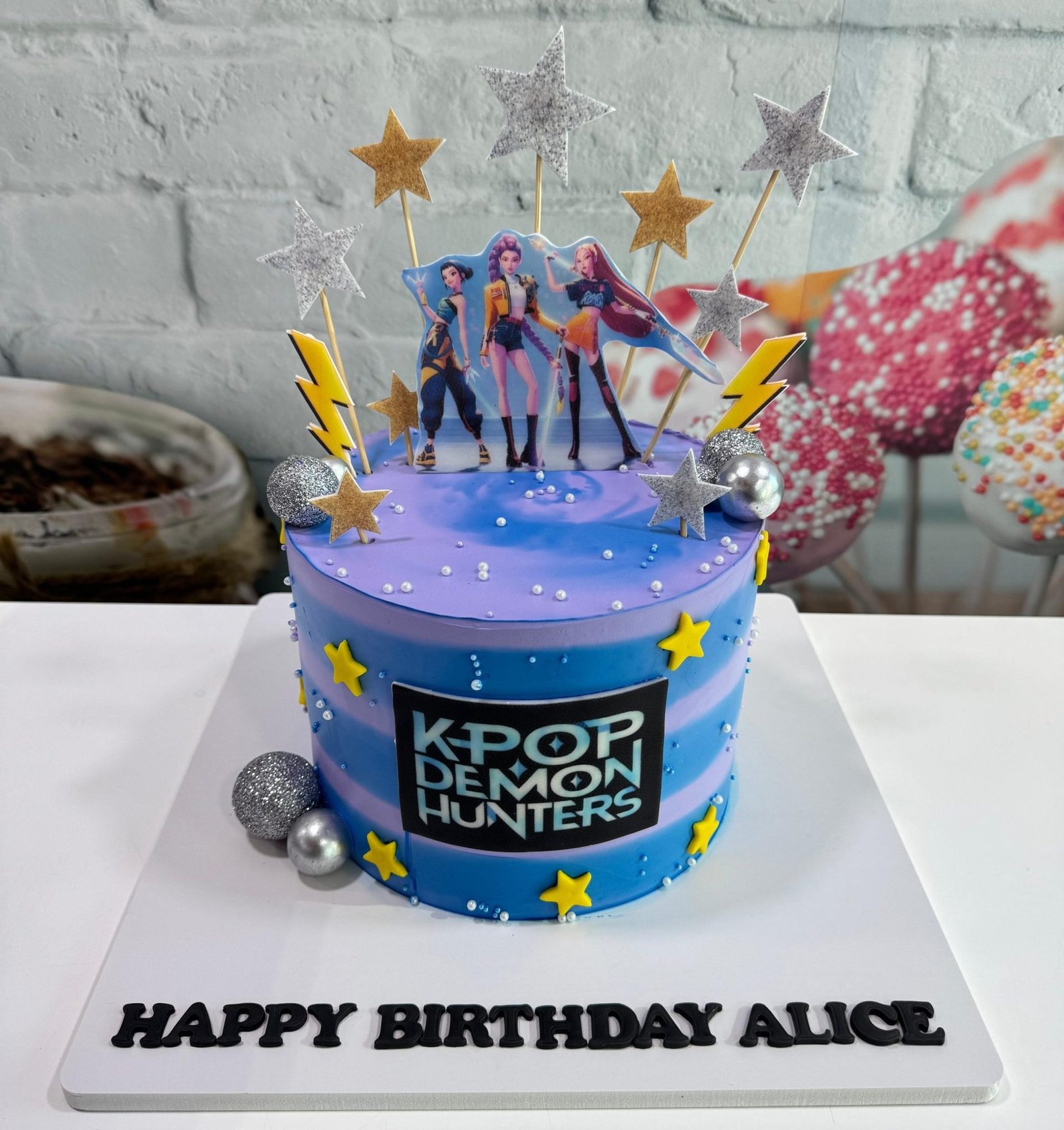 A vibrant, two-tiered cake in blue and purple, featuring K-Pop character cutouts, glittering stars, and lightning bolt accents. Perfect for a gamer or K-Pop fan’s birthday!