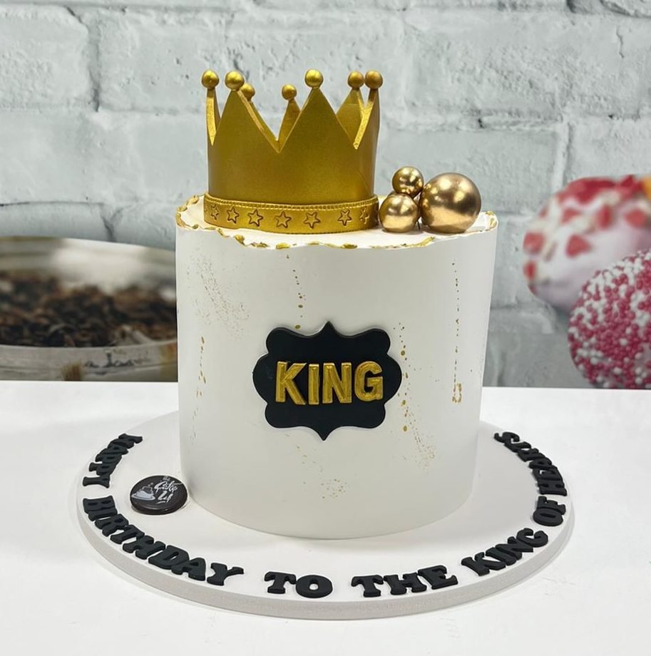 A majestic white cake dusted with gold, topped with a striking gold crown and spheres. Fit for royalty.