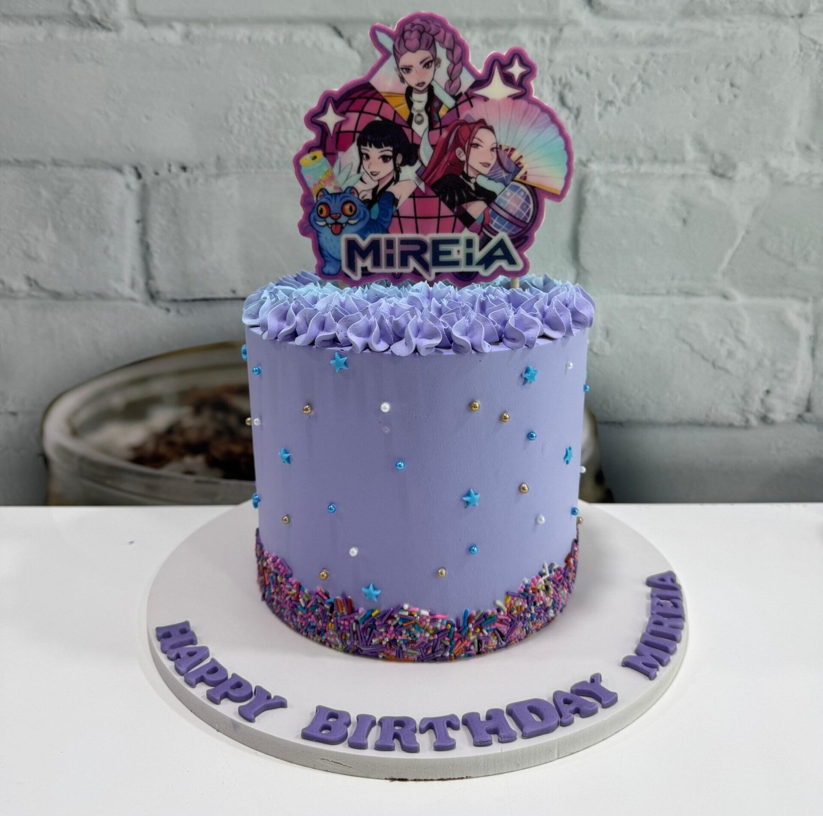 A vibrant lavender buttercream cake topped with pop-art characters, finished with colorful sprinkles and blue stars.