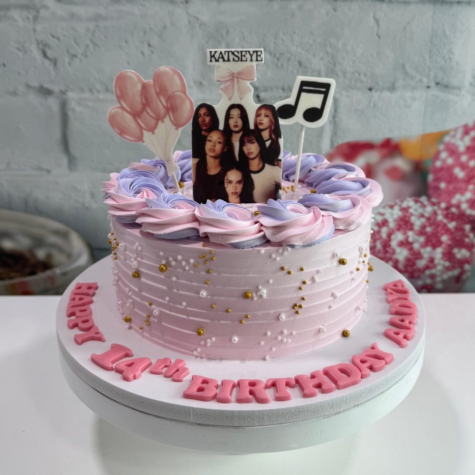 A trendy pink and lavender birthday cake featuring a custom group photo topper, musical notes, and delicate balloon accents, finished with edible gold pearls.