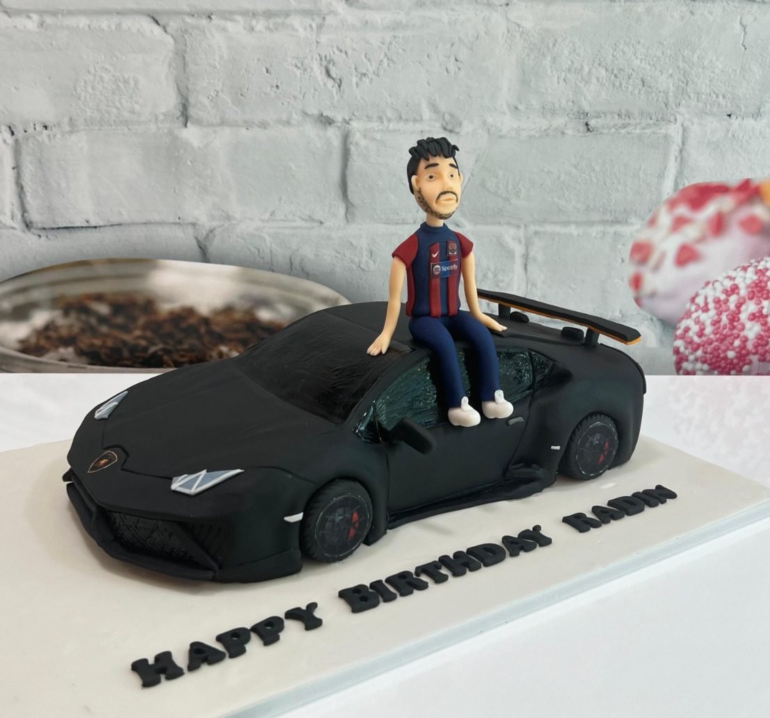 A stunning 3D cake sculpted into a matte black Lamborghini sports car. The design features a custom edible figurine of the birthday person sitting on the roof. Perfect for a car enthusiast