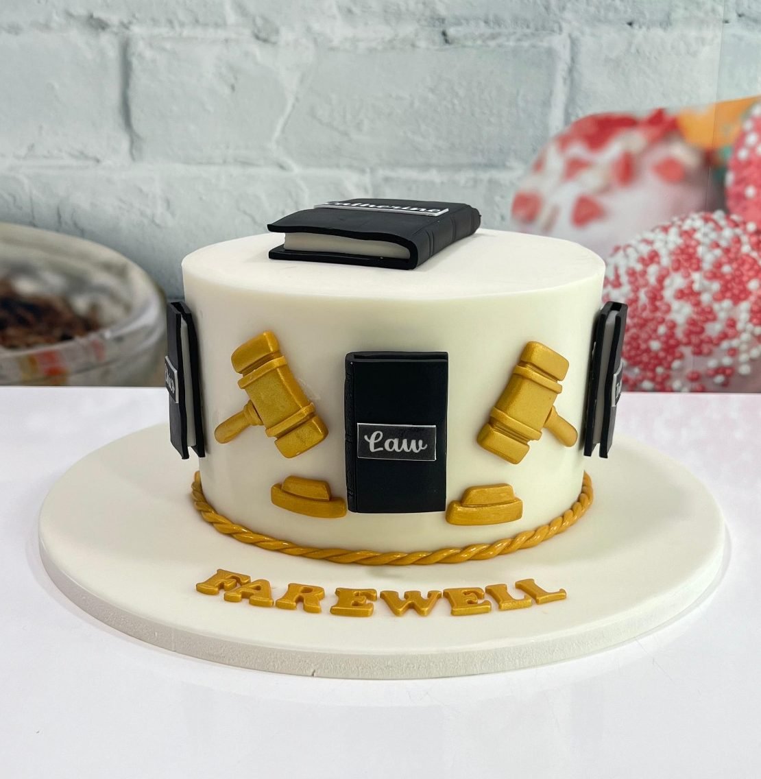 A simple white cake perfect for a farewell or graduation for someone in the legal field. The sides are decorated with golden gavels, scales of justice, and law books. A black law book sits on top. The cake board reads a simple “FAREWELL.”