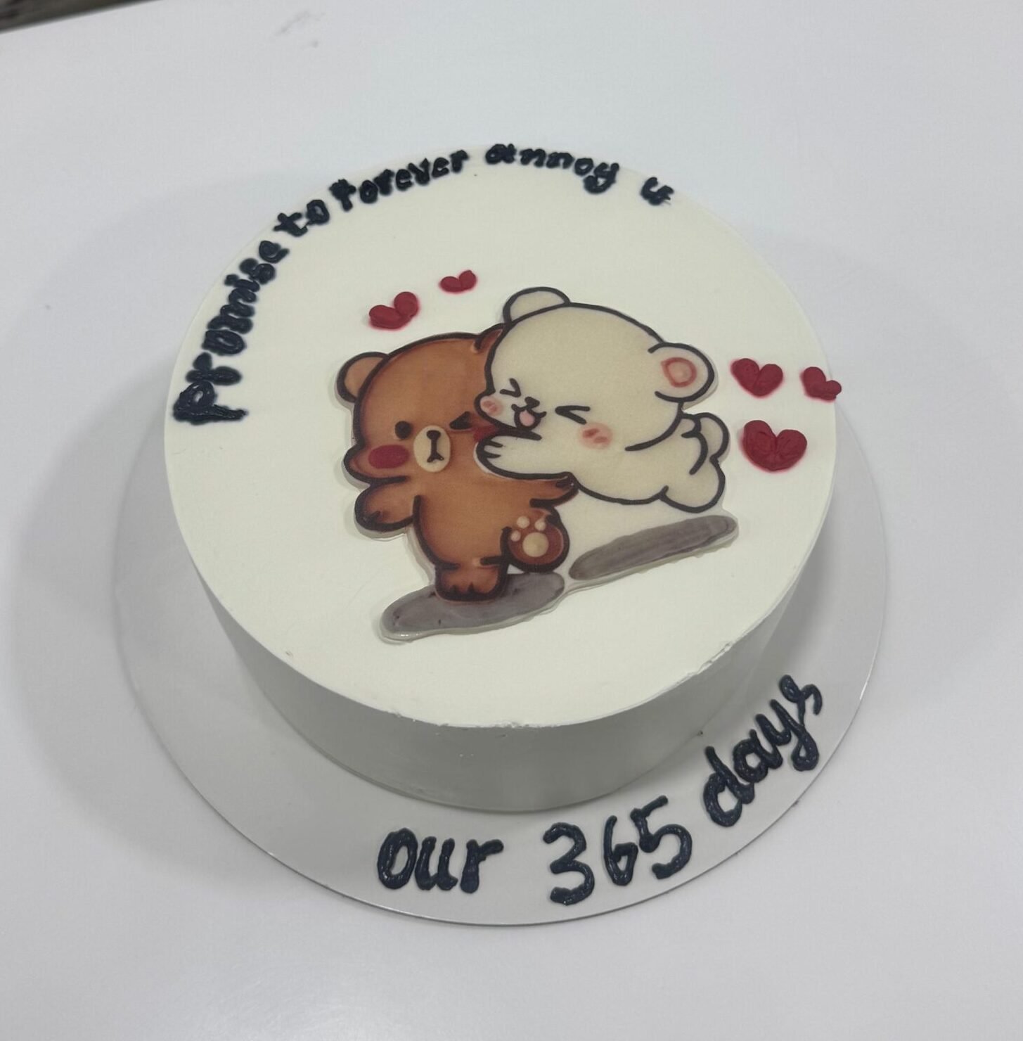 Commemorate your special milestone with a touch of playful romance. This minimalist white cake features adorable illustrated characters and heartfelt hand-lettered messaging, offering a clean and modern aesthetic for celebrating your unique journey together.