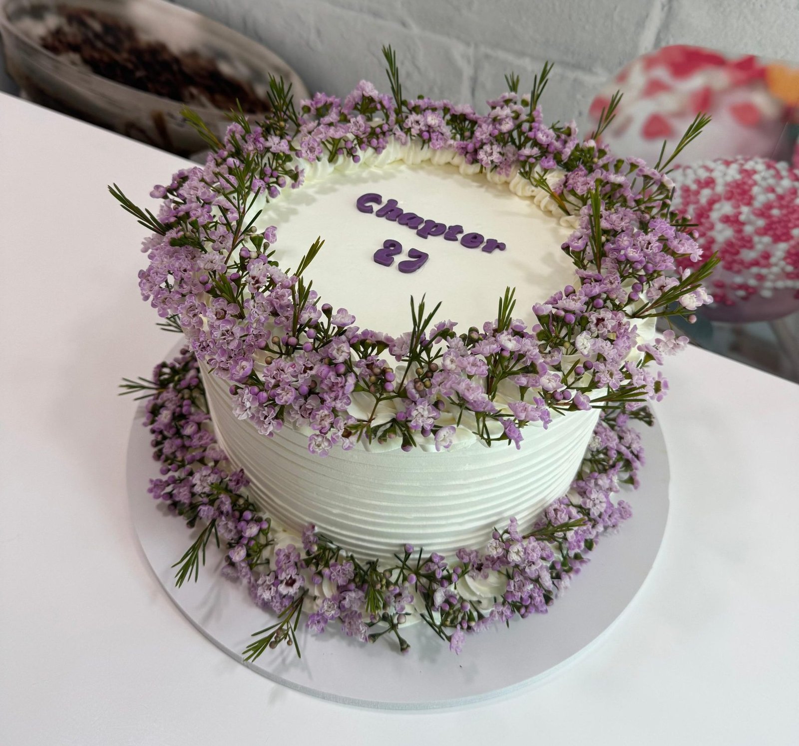 Sophisticated white cake ideal for a milestone or achievement. Elegantly wrapped in a fresh wreath of purple and green filler flowers.