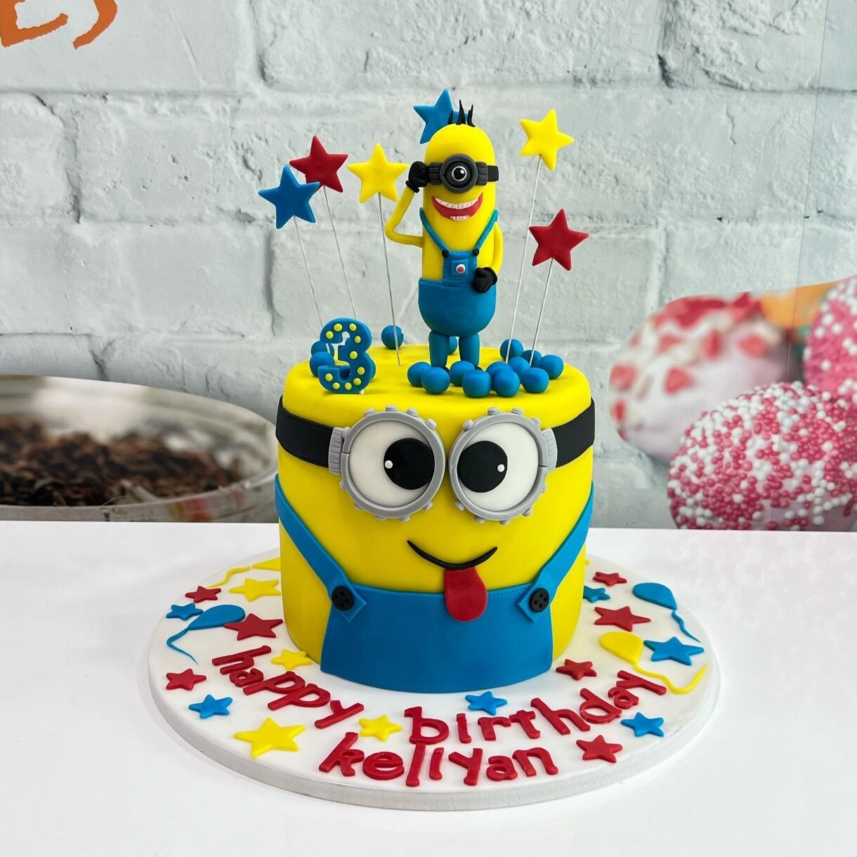 Bring some fun to the party with this bright yellow Minion-themed cake. The tier is designed to look like a Minion’s face, complete with oversized goggles and a playful expression. It is topped with a handcrafted Minion figurine surrounded by colorful fondant stars and balloons.