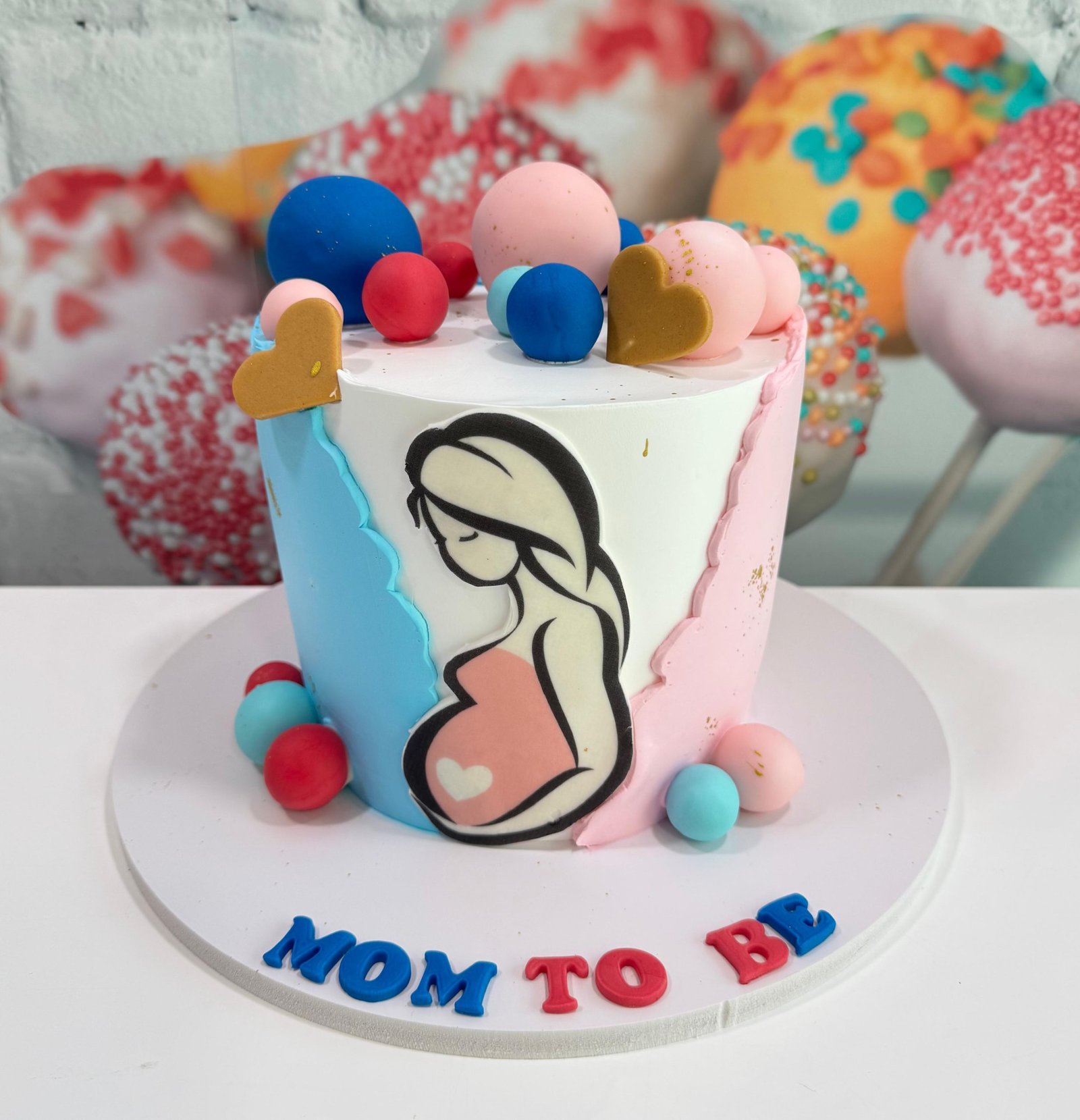Celebrate motherhood with this elegant pink and blue baby shower cake, topped with hearts and fondant balls—perfect for gender-neutral or gender-reveal themes.