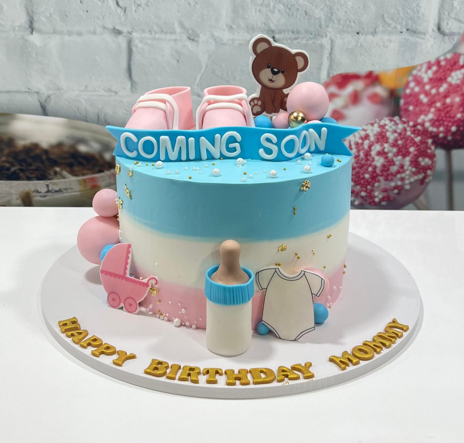 Joyful baby shower/birthday cake with soft pink, blue, and white stripes. Decorated with a “COMING SOON” banner and numerous 3D baby item decorations (stroller, bottle, booties).