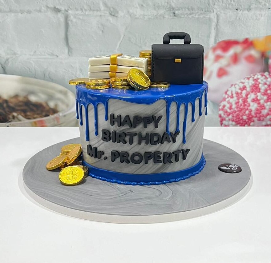 A sleek marble-effect cake with a blue drip, topped with gold coins, stacks of cash, and a professional briefcase.