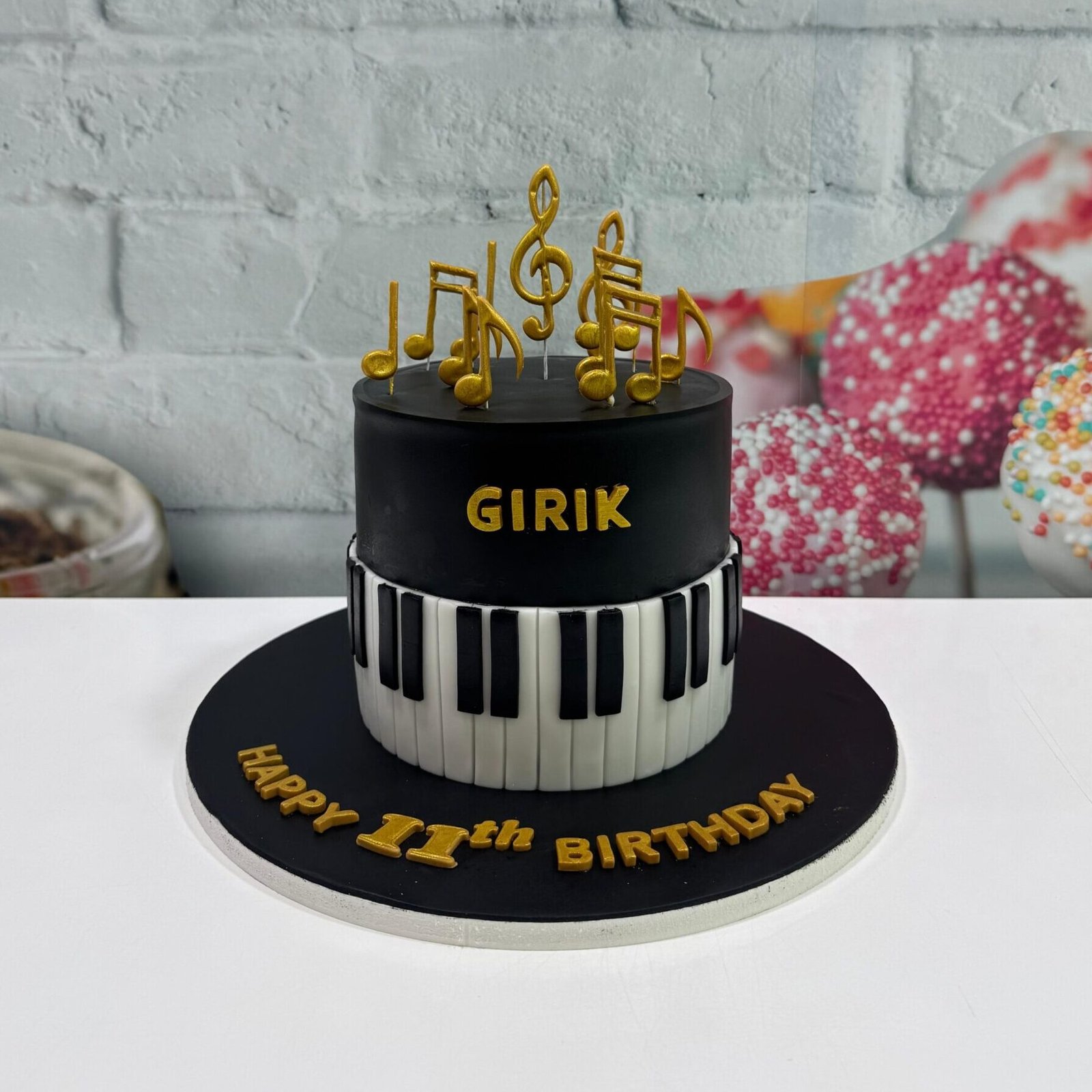 A sophisticated tribute for the music lover. This sleek, black-frosted cake features a meticulously detailed piano keyboard wrap around the base, topped with shimmering gold musical notes and a treble clef. Personalized with name in gold lettering.