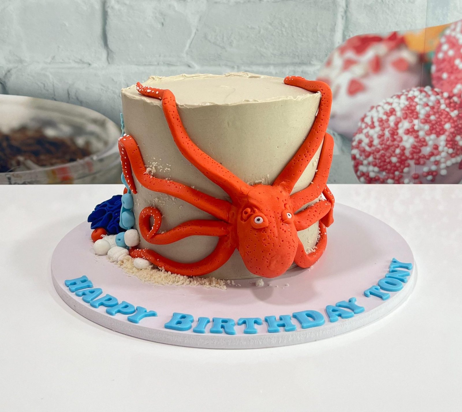 Dive into fun with this ocean-themed cake featuring a bold fondant octopus wrapping around the sides. Great for marine lovers and underwater-themed birthdays!