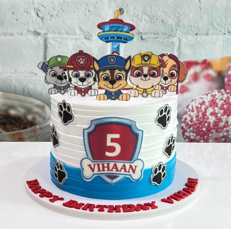 No job is too big, no pup is too small! This textured white buttercream cake features all your favorite Paw Patrol characters, custom paw-print accents, and a bold blue base for an unforgettable 5th birthday.