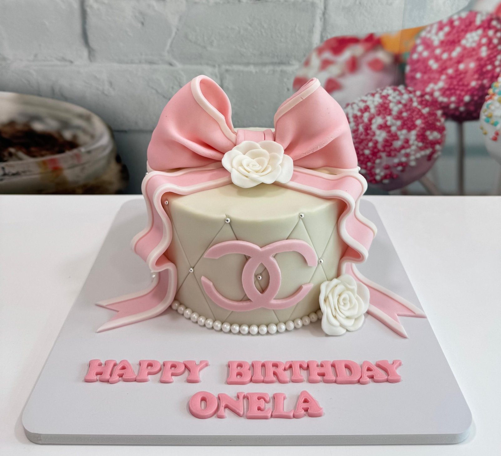 An elegant, fashion-inspired cake featuring a quilted pattern, a prominent pink designer logo, and a large, stunning pink fondant bow. Perfect for a milestone birthday or fashionista celebration.