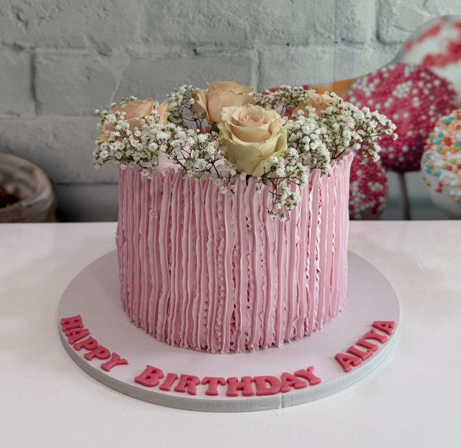 An elegant and feminine design featuring delicate, vertical pink ruffled piping around the entire cake. The top is crowned with a beautiful arrangement of peach-colored roses and baby’s breath, creating a soft, sophisticated look for a special birthday.
