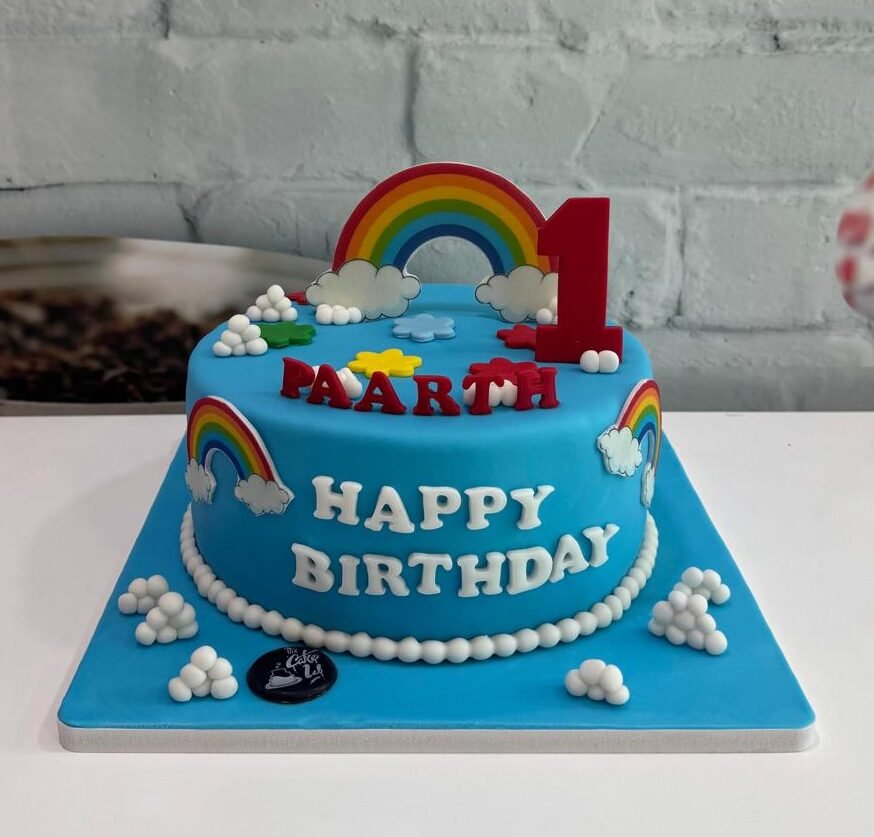 A cheerful blue fondant cake featuring 3D rainbows, fluffy white clouds, and colorful star accents. Topped with a large red number one for a first birthday celebration.