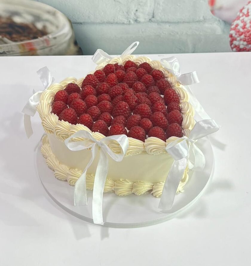 A romantic, heart-shaped cream cake overflowing with fresh raspberries and adorned with delicate white silk bows.