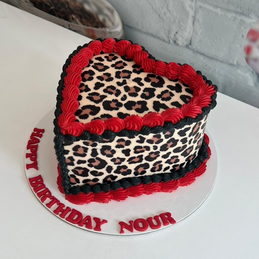 A stylish heart-shaped cake featuring a bold leopard print pattern. Framed with vibrant red and black buttercream piping, it’s a chic choice for a fashionable birthday celebration.
