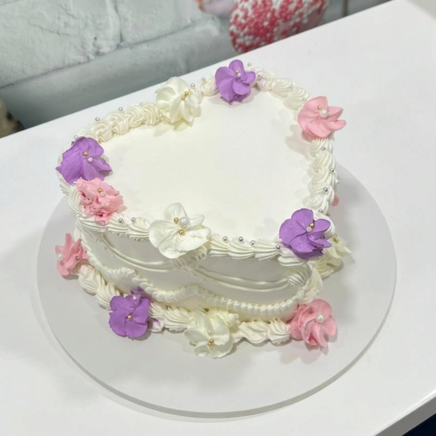 A romantic and timeless choice, this heart-shaped cake features intricate Lambeth-style buttercream piping. Hand-piped swags and delicate white borders are accented with soft pink, purple, and cream buttercream flowers. Finished with elegant silver and gold pearls, this cake is a beautiful centerpiece for anniversaries, birthdays, or bridal showers.