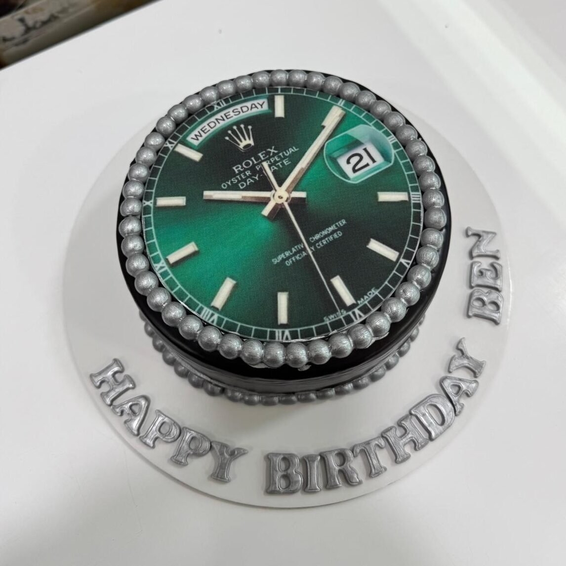High-precision edible art. This cake replicates the iconic green sunray dial of a Rolex Day-Date, finished with a silver bead “bezel” and personalized birthday messaging.