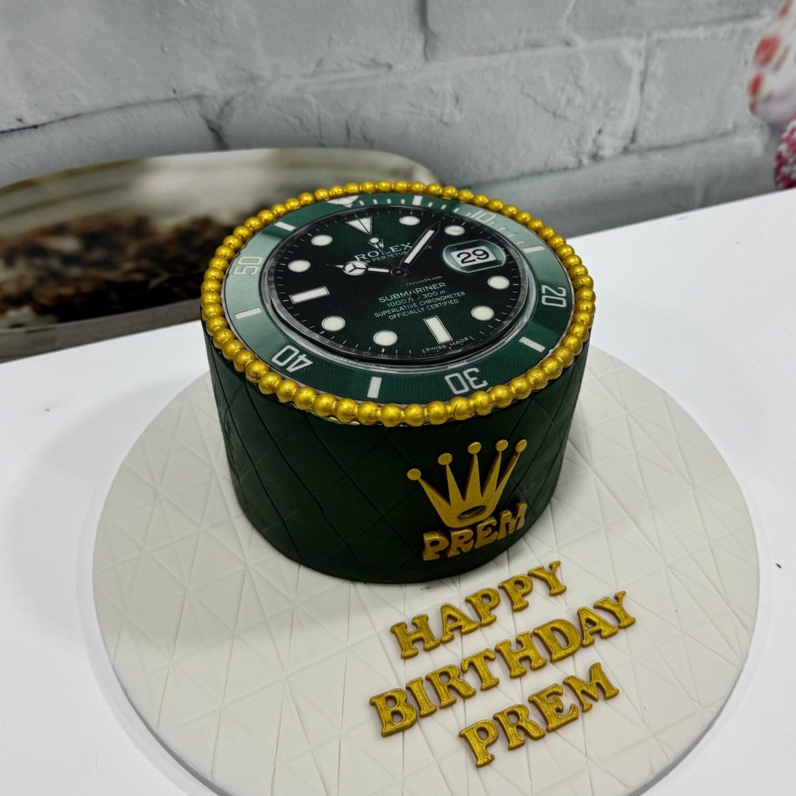A luxury-themed cylindrical cake designed to resemble a Rolex Submariner. Features a deep green quilted fondant finish, a detailed watch face edible print, and a golden beaded rim.